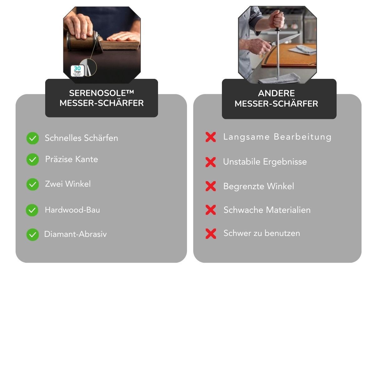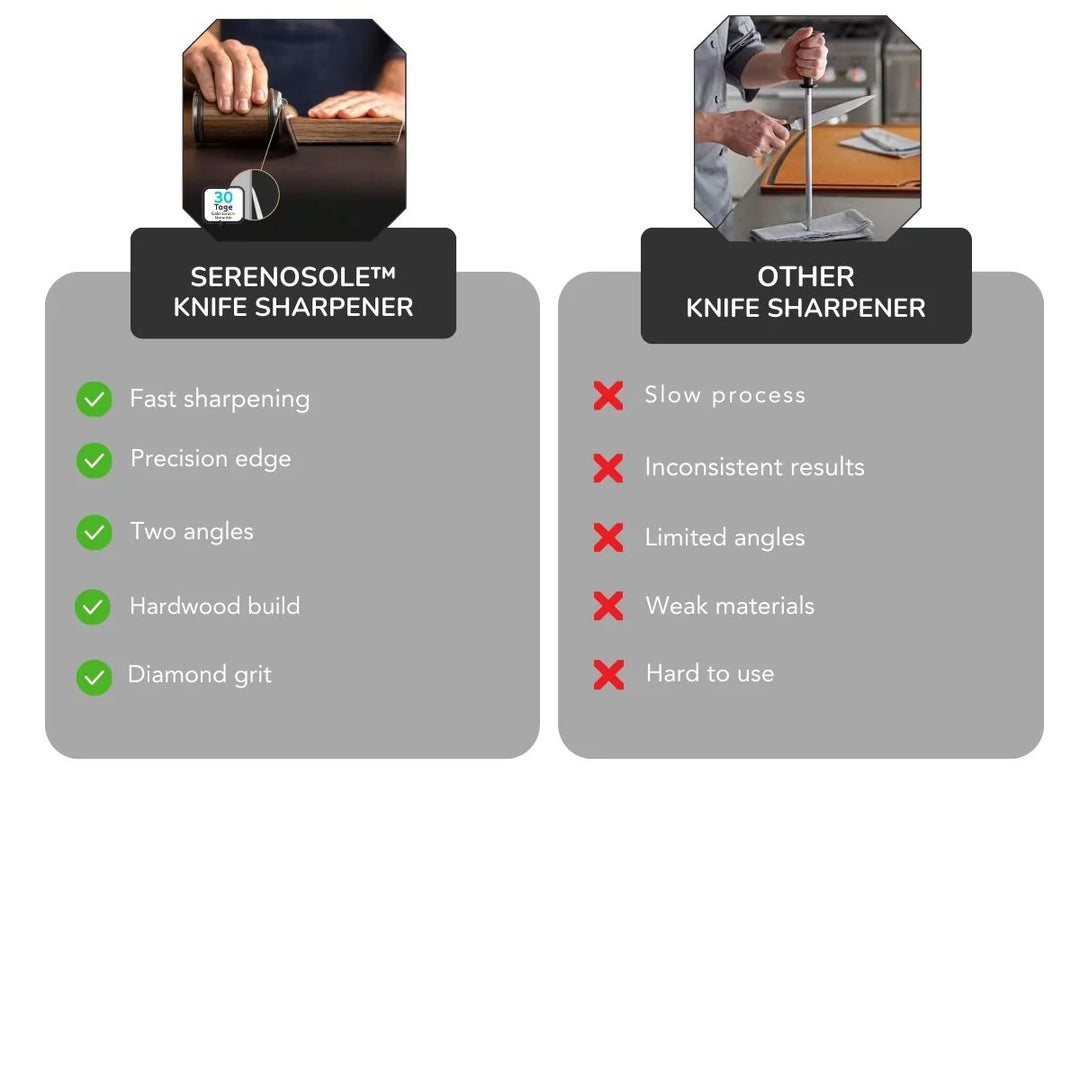 Erfahre, warum Serenosole™ SharpMaster besser ist als andere Messerschärfer. Während einige Schärfer unordentlich, langsam oder schwer zu bedienen sind, ermöglicht Serenosole™ SharpMaster ein schnelles, müheloses Schärfen, eine super präzise Schneide und ist so einfach zu bedienen. Es ist die clevere, stressfreie Art, deine Messer jedes Mal rasiermesserscharf zu halten!